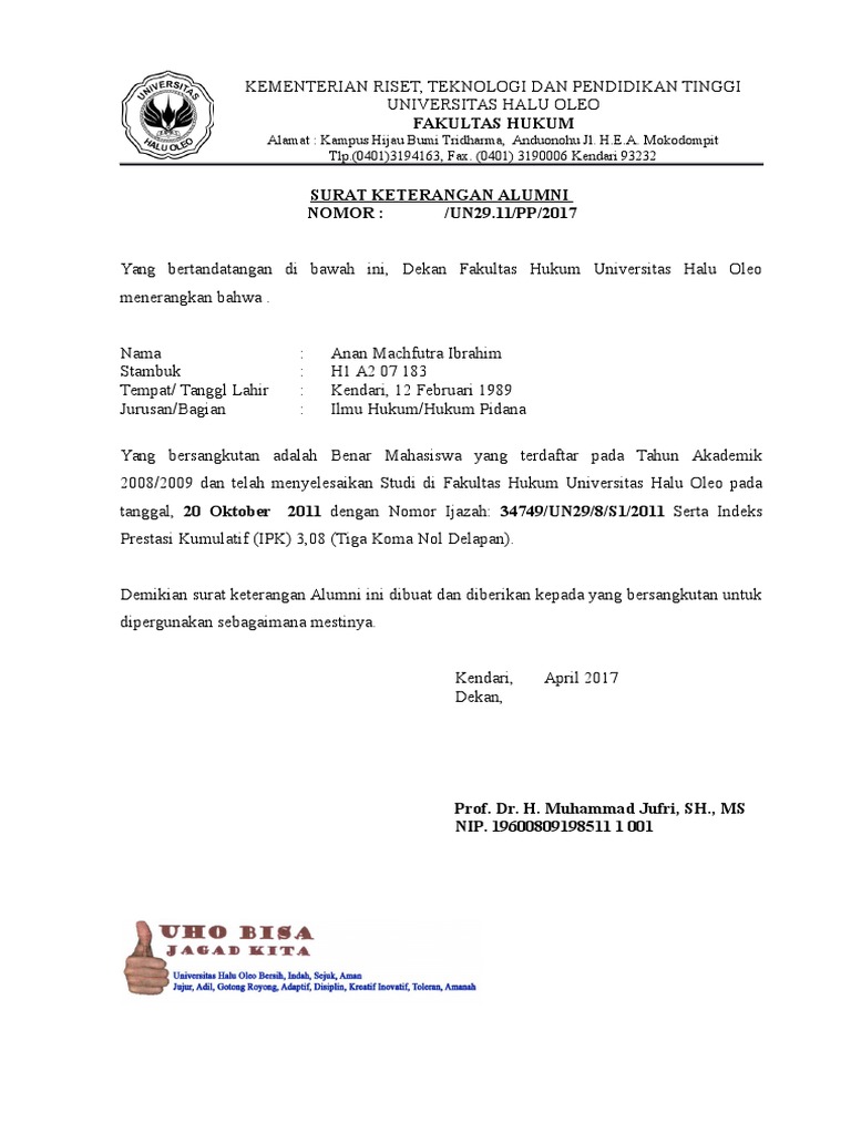 Menulis contoh surat keterangan alumni mahasiswa suatu hal tidak sulit. Biasanya, tiap-tiap contoh surat ini memiliki template surat resmi masing-masing. Melalui format itu pula, kita atau perusahaan bisa dikenali bersama dengan mudah. Surat dinas merupakan surat resmi yang dikeluarkan oleh suatu lembaga untuk beraneka kepentingan. Surat dinas berwujud resmi yang dapat dikeluarkan oleh pemerintah dan perusahaan, baik swasta maupun negeri. Surat dinas bermanfaat sebagai pedoman untuk jalankan sebuah tugas. Tugas tersebut dapat berupa instruksi, pengambilan keputusan, dan perizinan untuk jalankan hal tertentu. Yuk cek contoh surat keterangan alumni mahasiswa.doc Ada 14 halaman contoh surat keterangan alumni mahasiswa ukuran Folio 3.5MB. Permohonan surat keterangan mahasiswa aktif fakultas teknik. contoh surat keterangan jurusan sma contoh surat. 6 contoh surat keterangan kuliah dari kampus dekan fakultas atau baak surat pendidikan mahasiswa Lihat juga soal tentang keterangan serta pahami materi contoh surat keterangan alumni mahasiswa